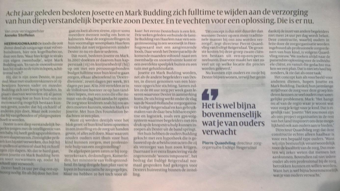 De afgelopen jaren zaten ze bij zorgverzekeraars, deskundigen, Kamerleden, het ministerie van Volksgezondheid. En lang dreigde hun plan vast te lopen in bureaucratische zorgregeltjes. Maar nu hebben ze het toch voor elkaar: het eerste Dexter-huis is een feit. Drie weken geleden verhuisde de familie Budding van Haarlem naar een eengezinswoning in een woonwijk in Heerhugowaard met een aangrenzende loods. Daar wordt het Dexterparadijs de komende maanden voltooid: naast een zwembadje en snoezelruimte komt er een overdekte speelplek buiten en een door geluidsisolatie afgeschermde tuin.